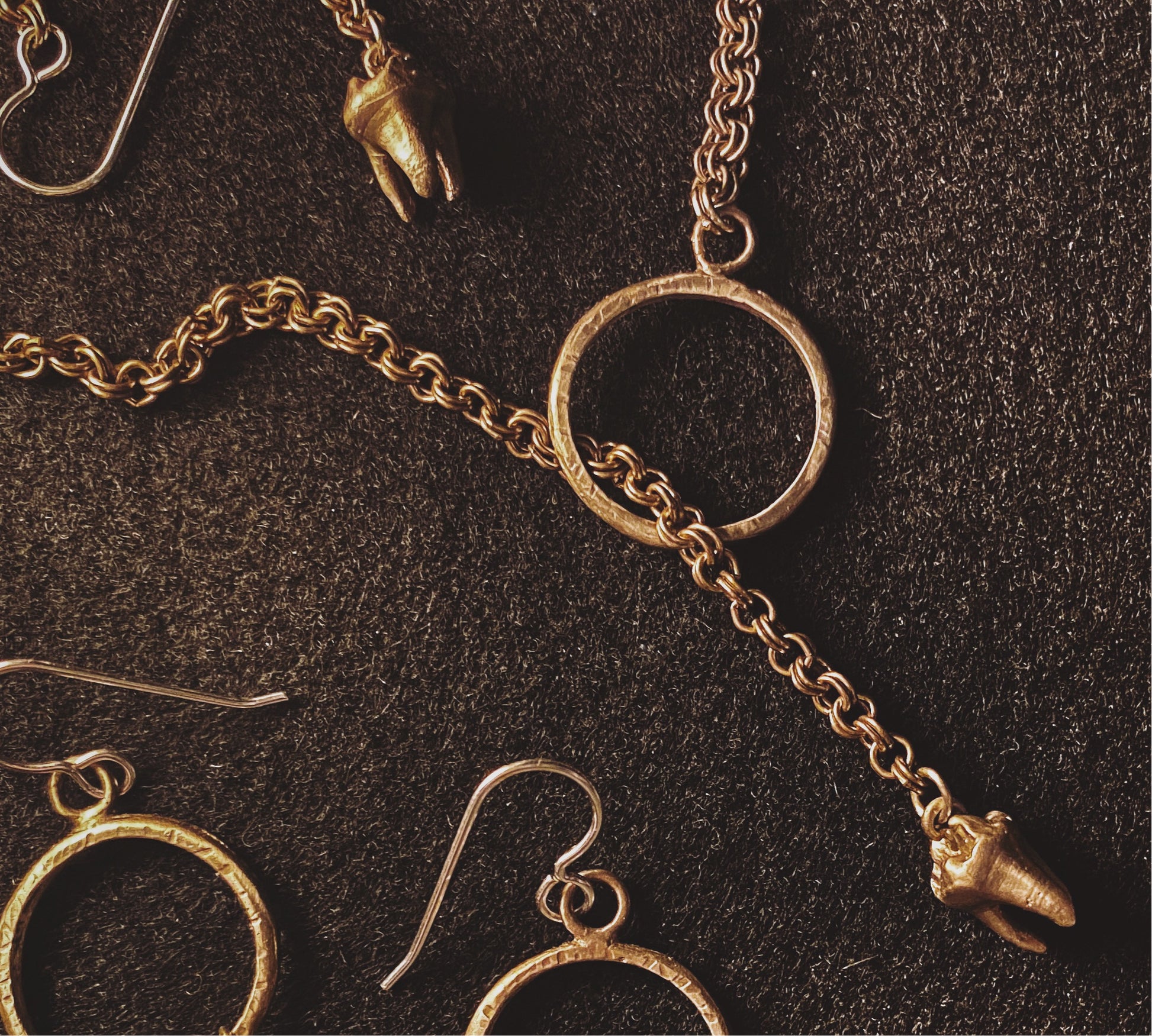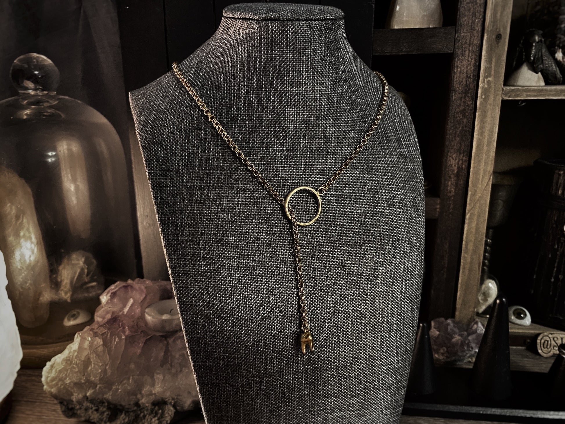 - Its antique gold plated double cable chain measures about 28" but can be adjusted as tight or loose as you like because it's a lariat. The hand carved and cast brass circle is used as an enclosure; just pass the tooth through and let dangle. Jump rings are 18K gold plated stainless steel.