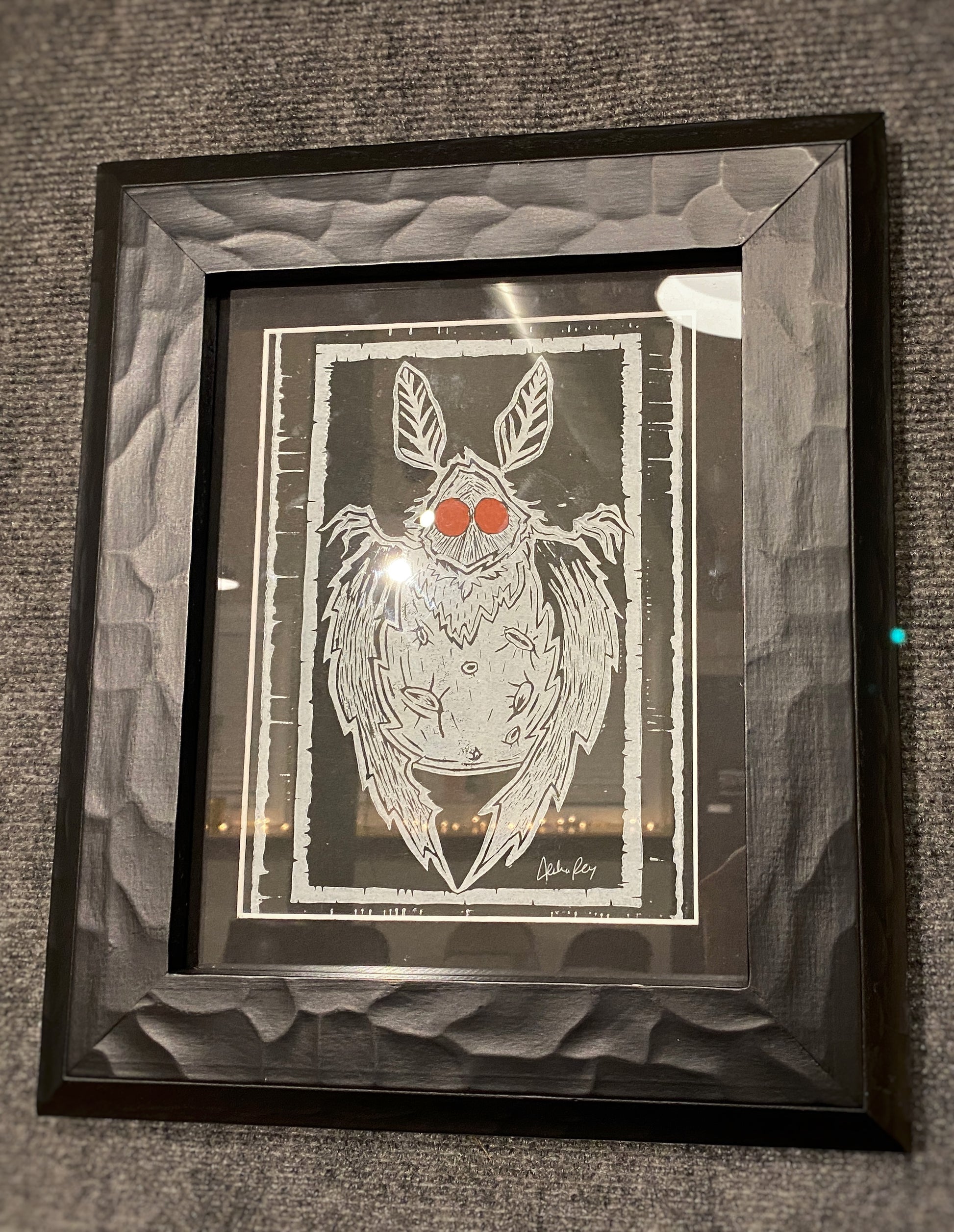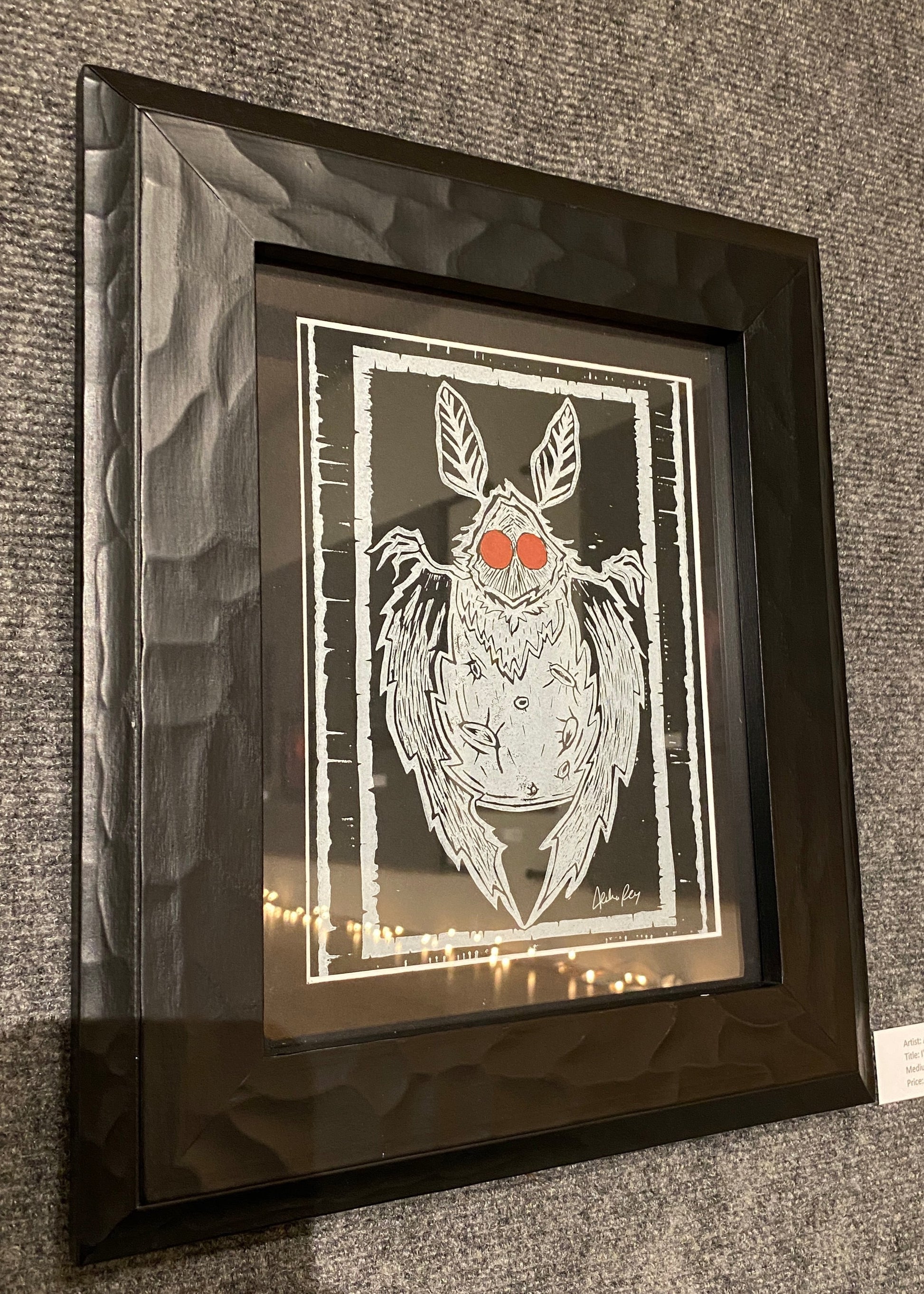 This design was created for the Cryptids & Curiosity show held by Third Sanctum Gallery in The Veiled Crow during November of 2023. It is inspired by my favorite crytpid: the Mothman of Point Pleasant, West Virginia. The title of this piece is a quote from John Keel's fascinating book The Mothman Prophecies and its subsequent film.