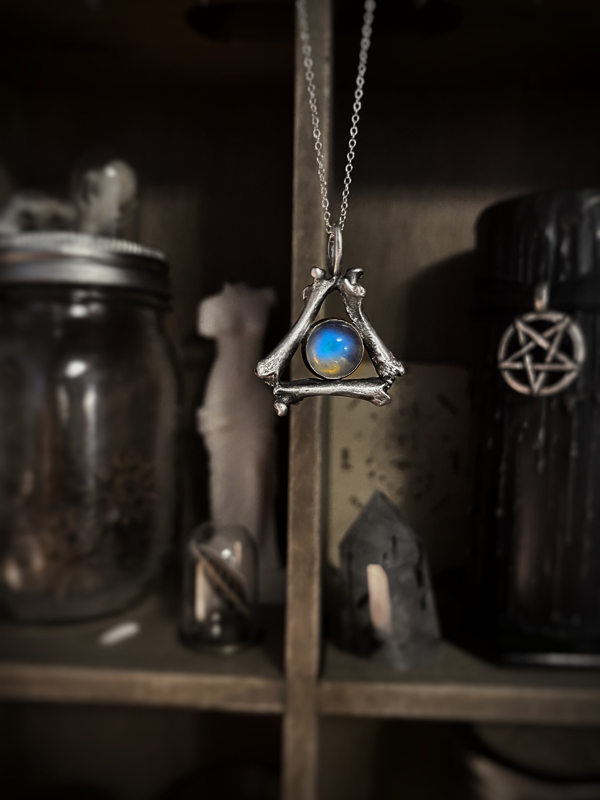 I present to you the first piece from The Coven Collection. Inspired by my love, my light, my daughter: Luna. A beautiful 'moon' sits in the center of three interlocking bones representing our family.