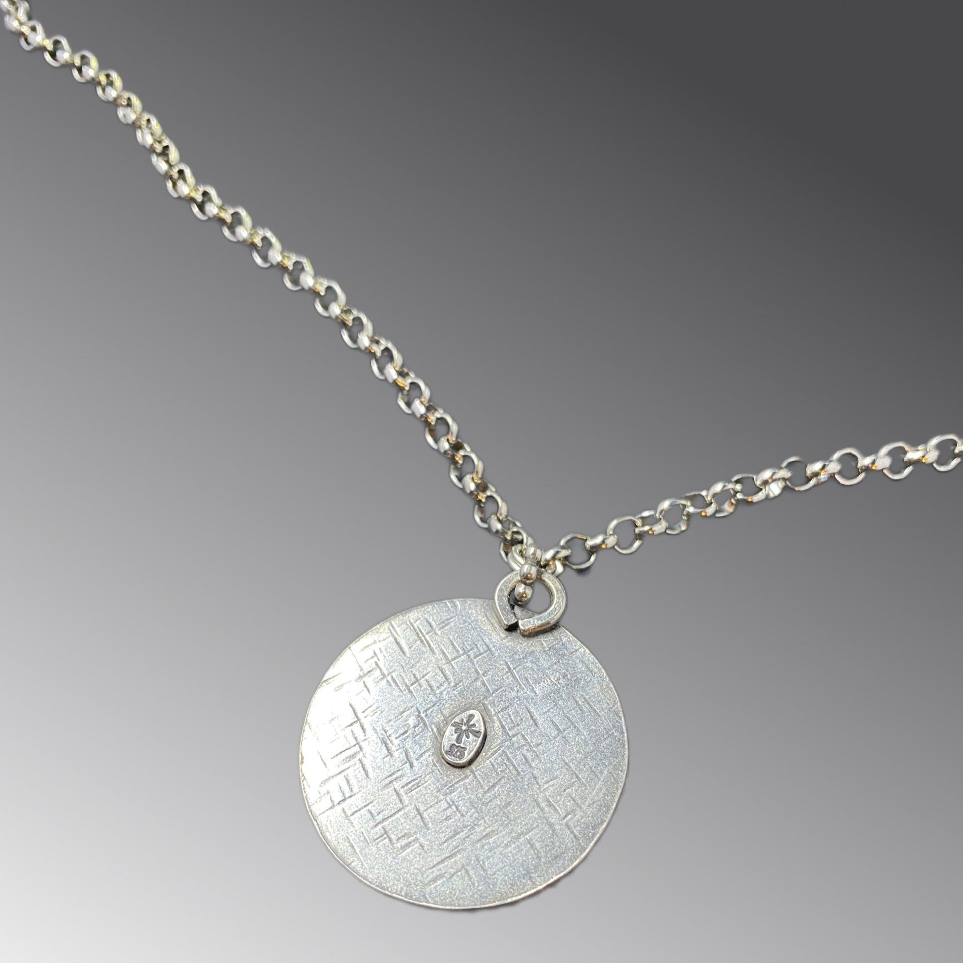 - The silver pendant was given a gloomy black patina before being polished to accentuate the textures of the metal. A protective microcrystalline wax coating has been applied to protect the patina.