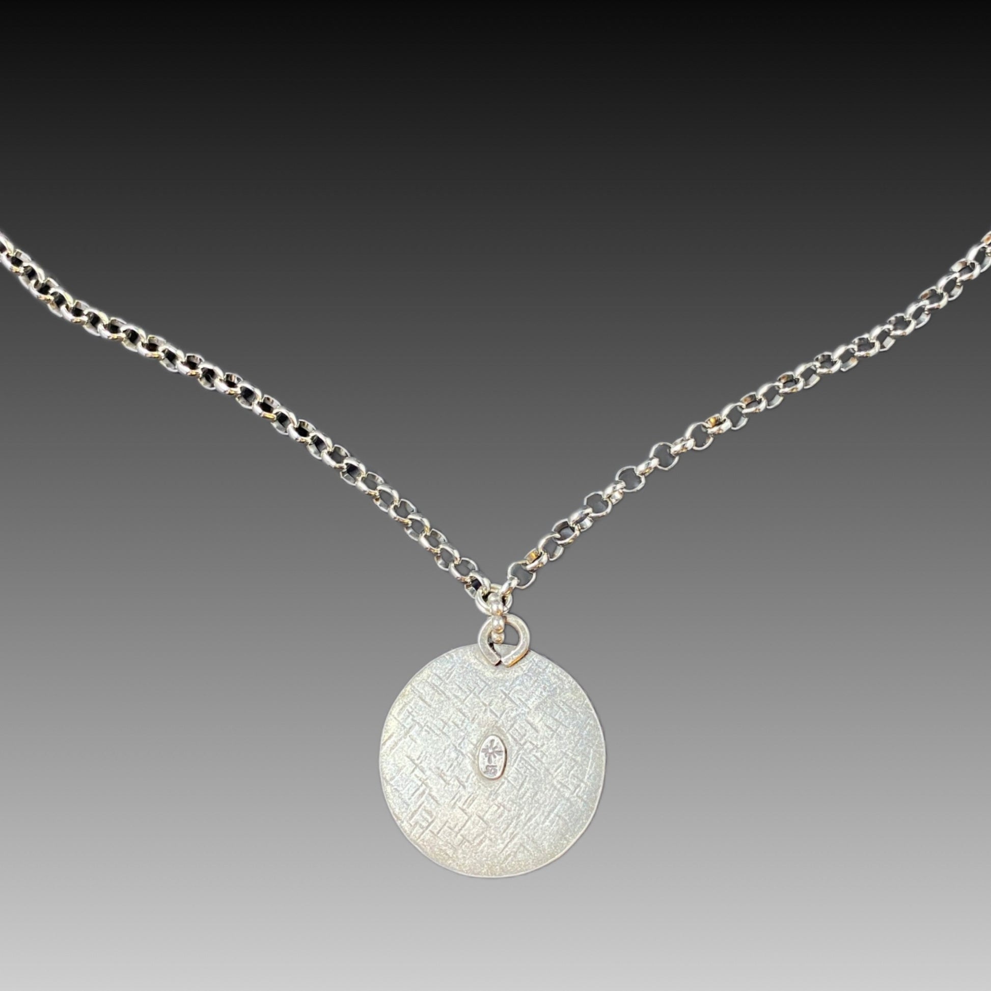- Hangs from a 22" silver plated steel rollo chain with sterling jump rings and a lobster clasp enclosure.