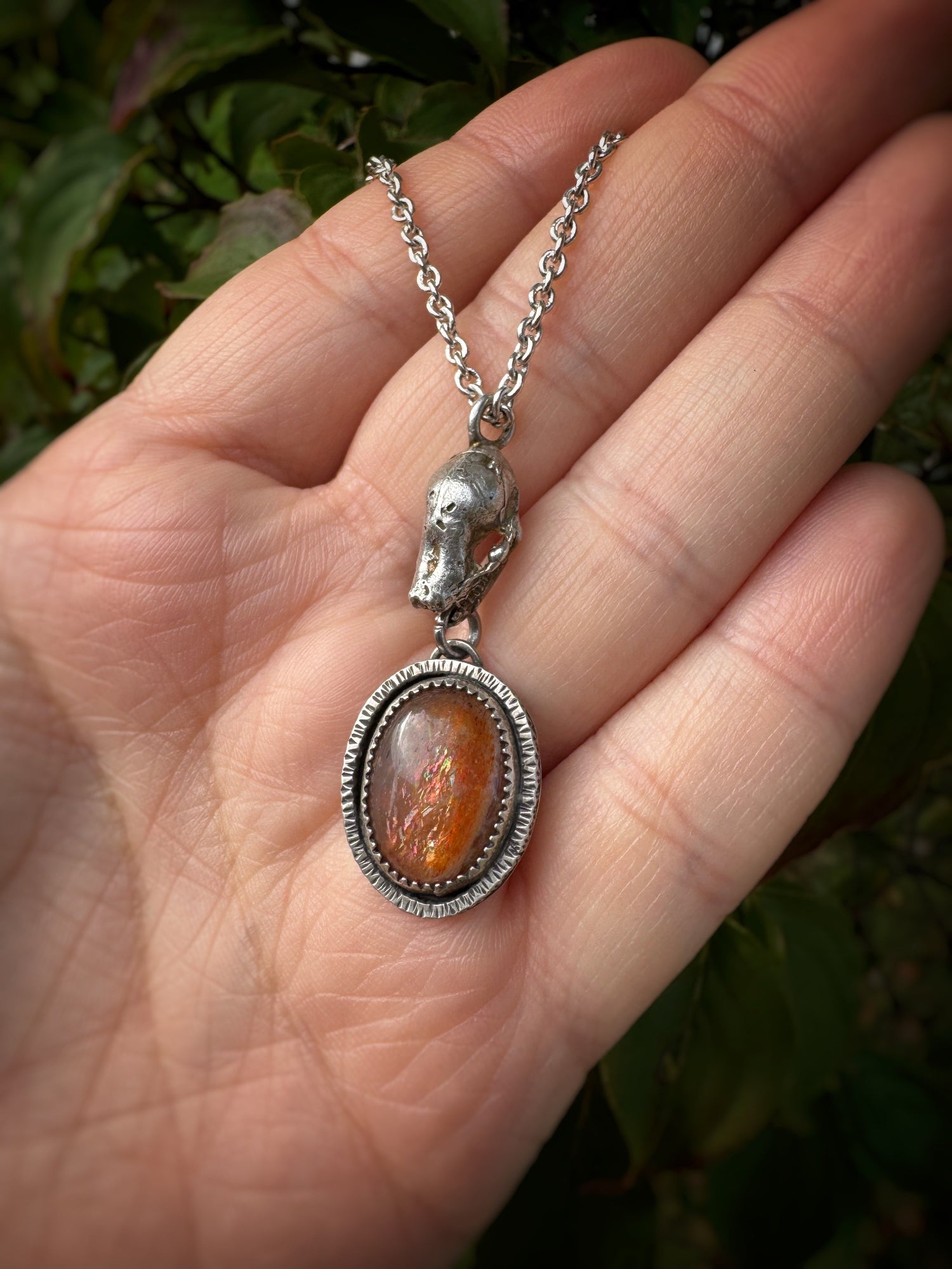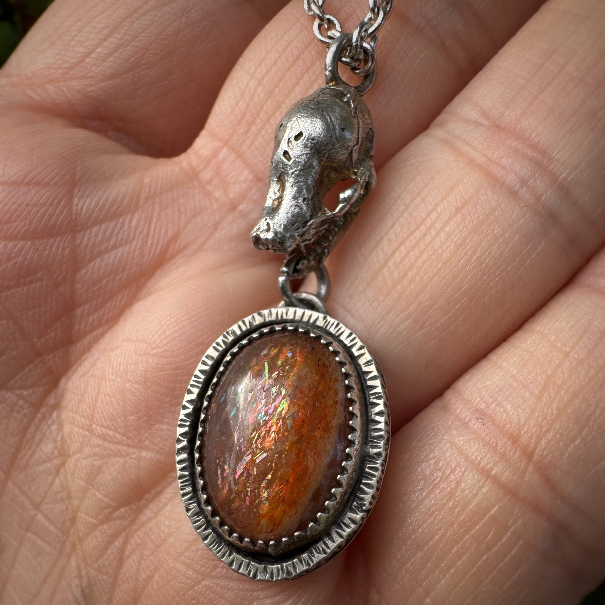 - Bat skull is cast in silver using the lost wax casting process. A sunstone hangs from it's mouth from a sterling jump ring.