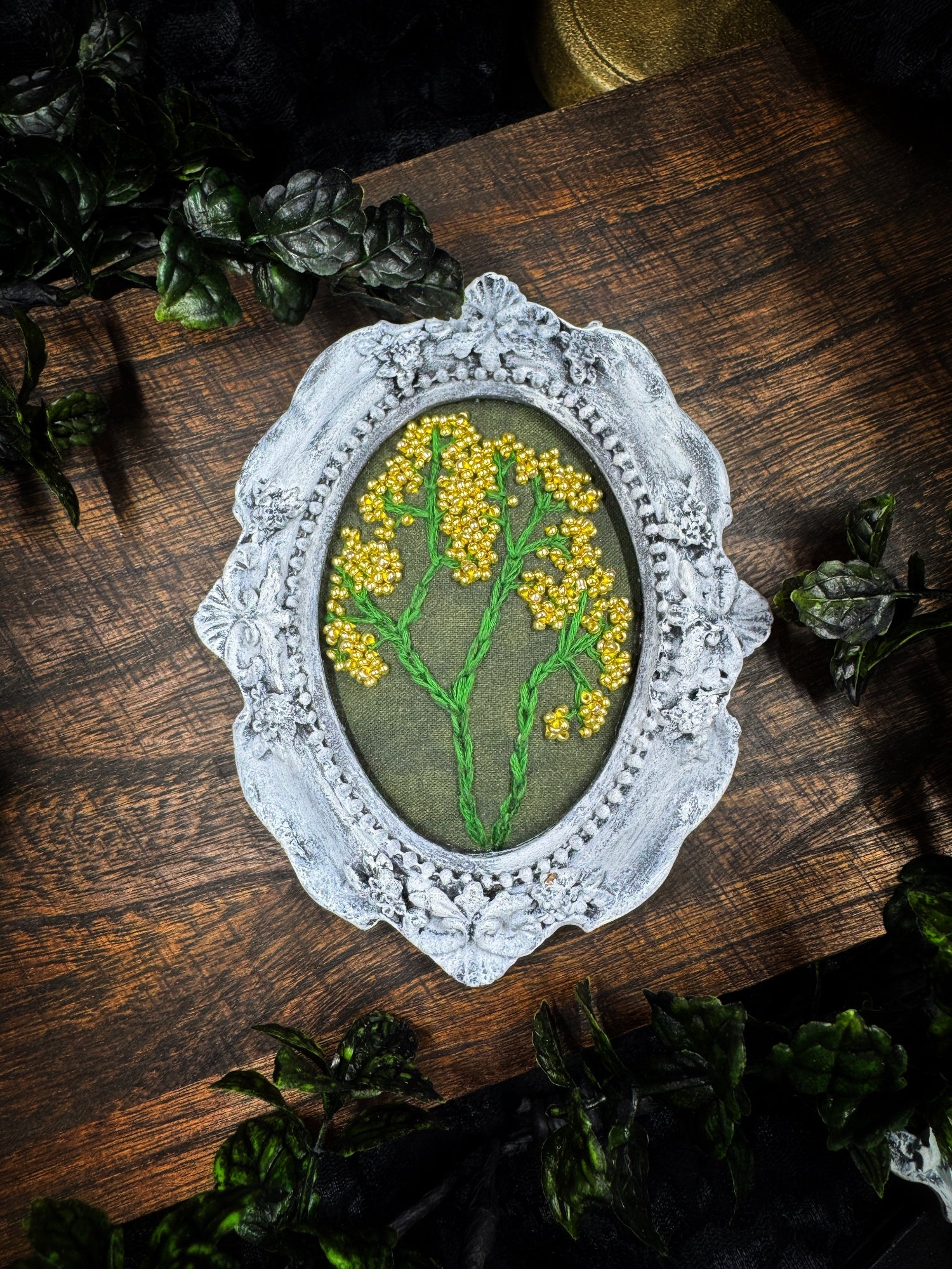 • A delicate little flowering yarrow plant has been embroidered onto a rich green fabric using embroidery thread and an assortment Czech glass beads.